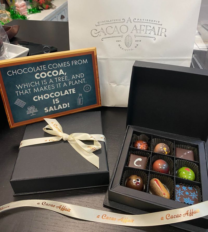 *We Are Now Serving Coffee!* Since 2013, A Cacao Affair has seen its artisan chocolate shop in Marietta, GA, grow! We have over 30 years of experience in the restaurant business, as well as natural love and curiosity, which have aided our adventure in discovering new chocolate productions. We pride ourselves on providing interesting flavors and creating a variety of chocolate creations for purchase - from full-size chocolate footballs to high-heeled shoes! We like to add new and exciting concoctions to the shop for every season and use only the finest ingredients. Stop in today or reach out to explore our chocolate love affair!